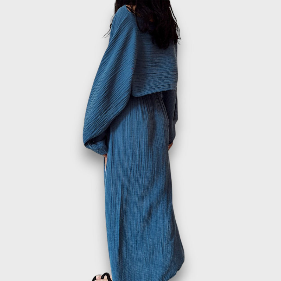 Elise ist ein Set, das sich mit dir bewegt – leicht, stilvoll und ganz ohne Anstrengung. Der lockere Schnitt umhüllt den Körper sanft, während seitliche Schlitze bei jedem Schritt einen Hauch von Rhythmus einbringen. Ein Look, der Raum lässt – und genau dann gut aussieht, wenn du es brauchst.