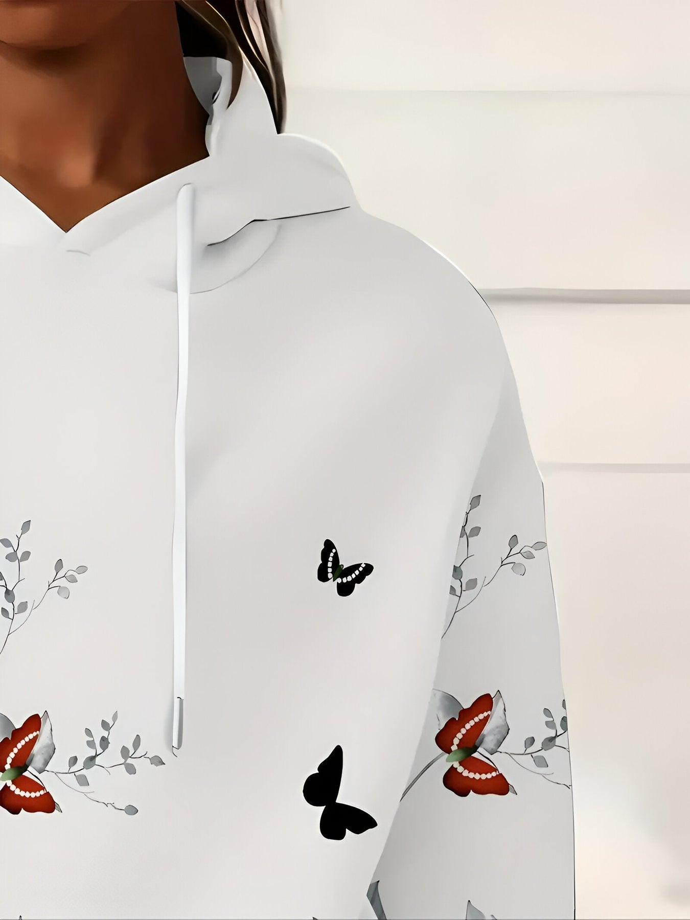 Stell dir vor, du schlüpfst in ein Hoodie, das ebenso bequem wie stilvoll ist. Mit seinem weichen Stoff und dem verspielten Schmetterlings-Print ist dieses Hoodie darauf ausgelegt, dich mühelos chic zu fühlen. Egal, ob du zu Hause entspannst, Besorgungen machst oder dich mit Freunden triffst, der lockere Schnitt und die gemütliche Kängurutasche machen es perfekt für jede lässige Gelegenheit. Die verstellbare Kapuze bietet zusätzlich Wärme und Vielseitigkeit, sodass du für alles bereit bist, was der Tag bringt.