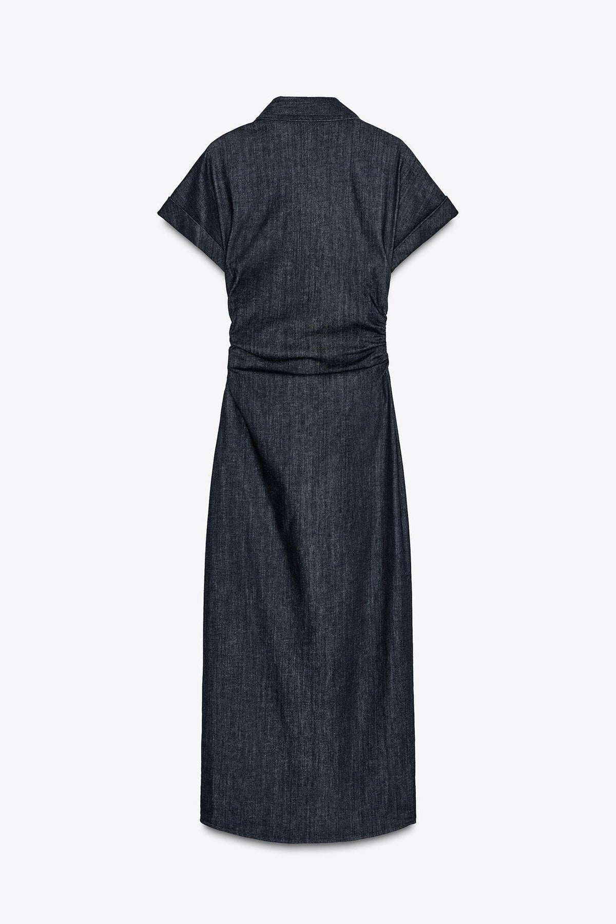 Dieses wunderschöne Denim Midi-Kleid kombiniert klassische Eleganz mit modernem Schnitt. Der umgeschlagene Kragen, der V-Ausschnitt und die kurzen Ärmel mit Manschetten verleihen dem Kleid einen schicken Look, während die figurbetonte Passform mit subtilen Falten an den Seiten Ihre Figur betont. Die falschen Knöpfe vorne fügen ein verspieltes Detail hinzu, während der verdeckte Reißverschluss an der Seite für eine nahtlose Passform sorgt.