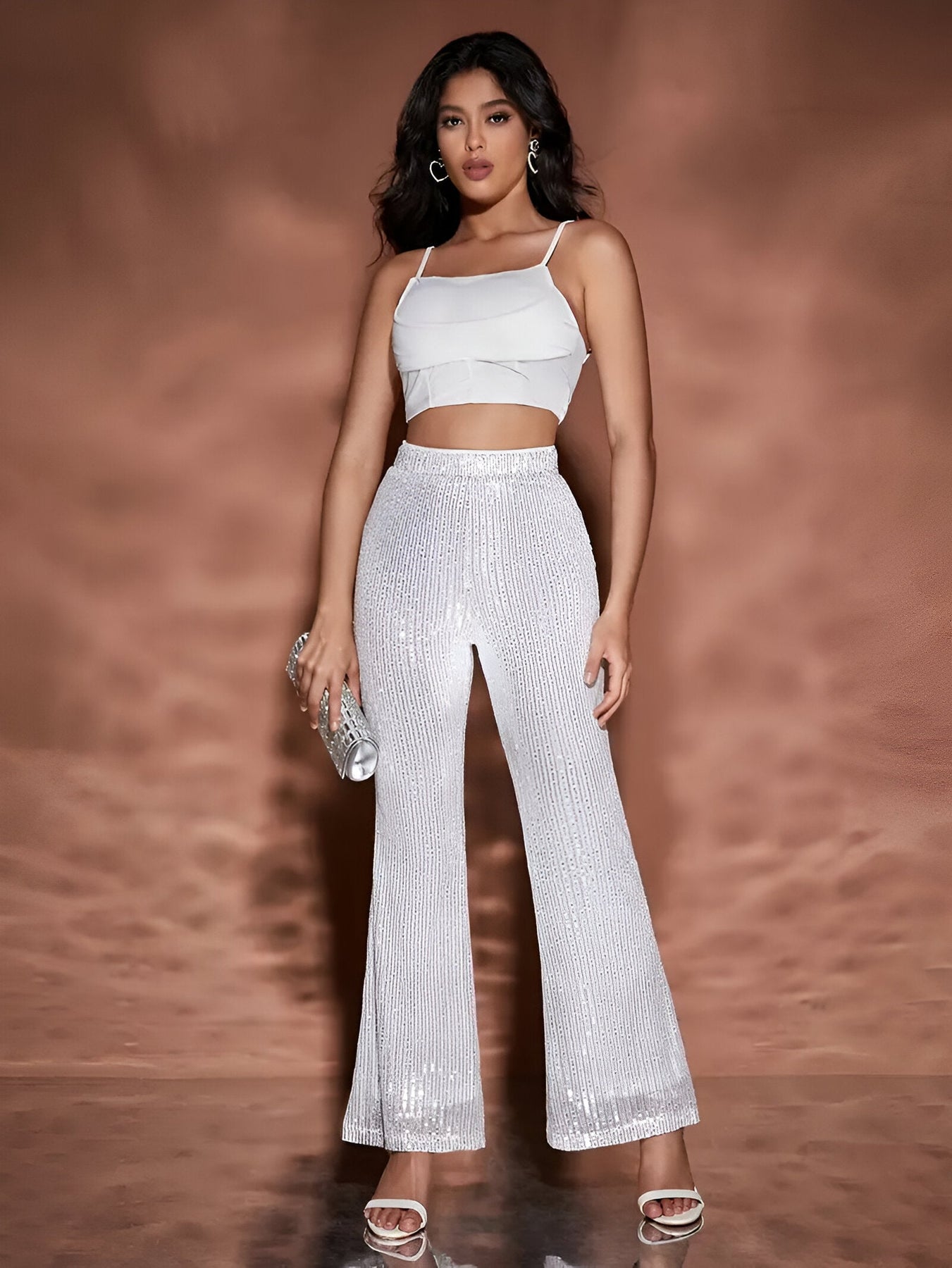 Stell dir vor, du trittst hinaus und ziehst sofort alle Blicke auf dich mit deinem mutigen, glamourösen Look. Diese Hose ist dein perfekter Begleiter, um ein Statement zu setzen und gleichzeitig mühelos schick zu bleiben. Die weiten Beine und funkelnden Pailletten schaffen eine atemberaubende Silhouette, die sich mit dir bewegt und jedem Anlass eine aufregende Note verleiht. Ob du nun für eine Nacht ausgehst oder ein besonderes Event besuchst, du wirst dich in jedem Moment selbstbewusst und stilvoll fühlen.