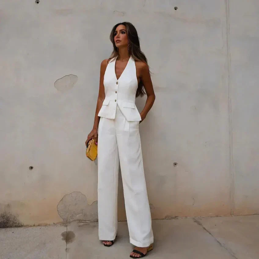 Verleihen Sie Ihrem Stil eine besondere Note mit unserem Set Arya, bestehend aus einer Trägerweste und einer hochtaillierten Hose.Dieses Set ist aus einer bequemen Stoffmischung gefertigt und kombiniert Mode und Flexibilität.
