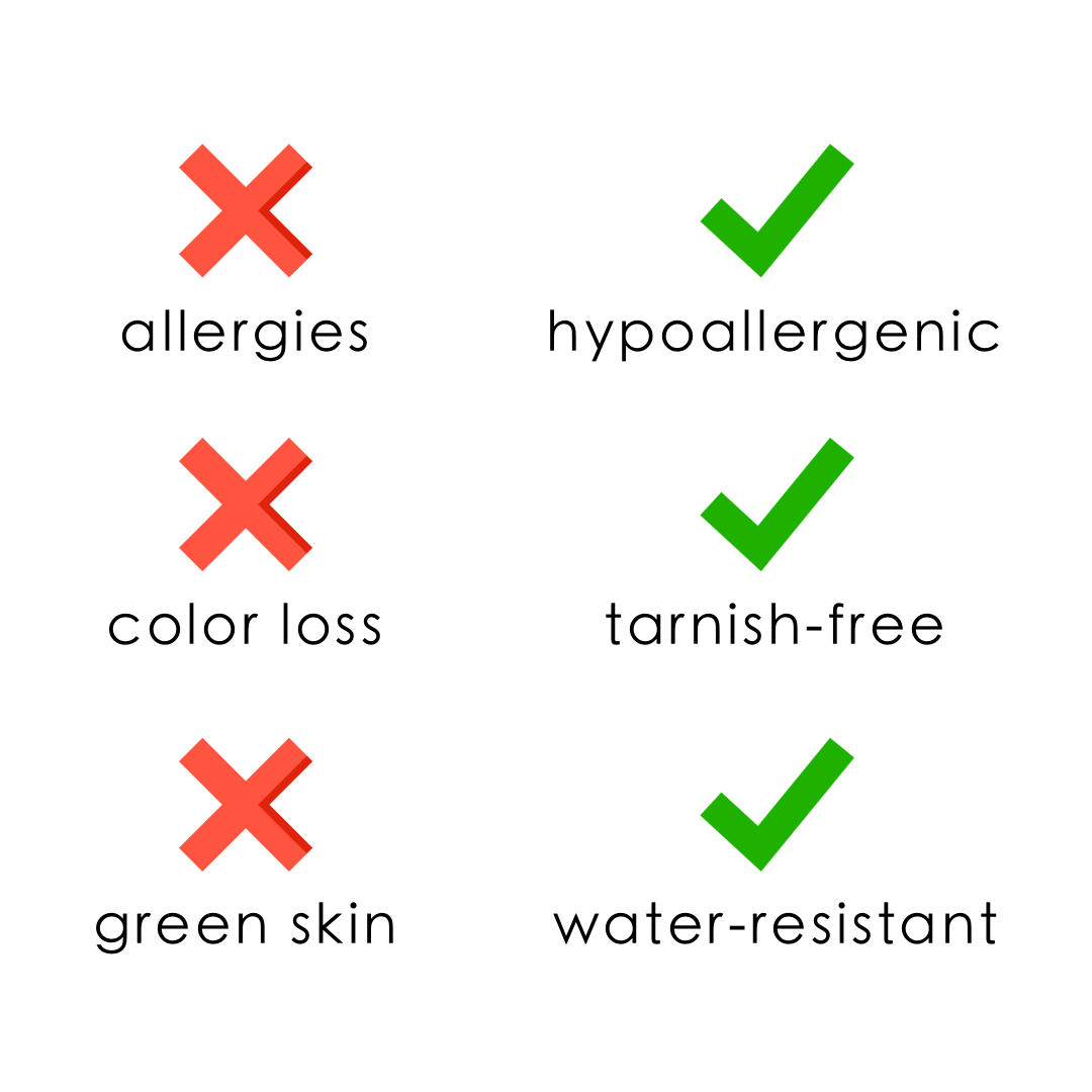 - Wasser-, schweiß- und hitzebeständig. (Keine Verfärbung, kein Anlaufen).