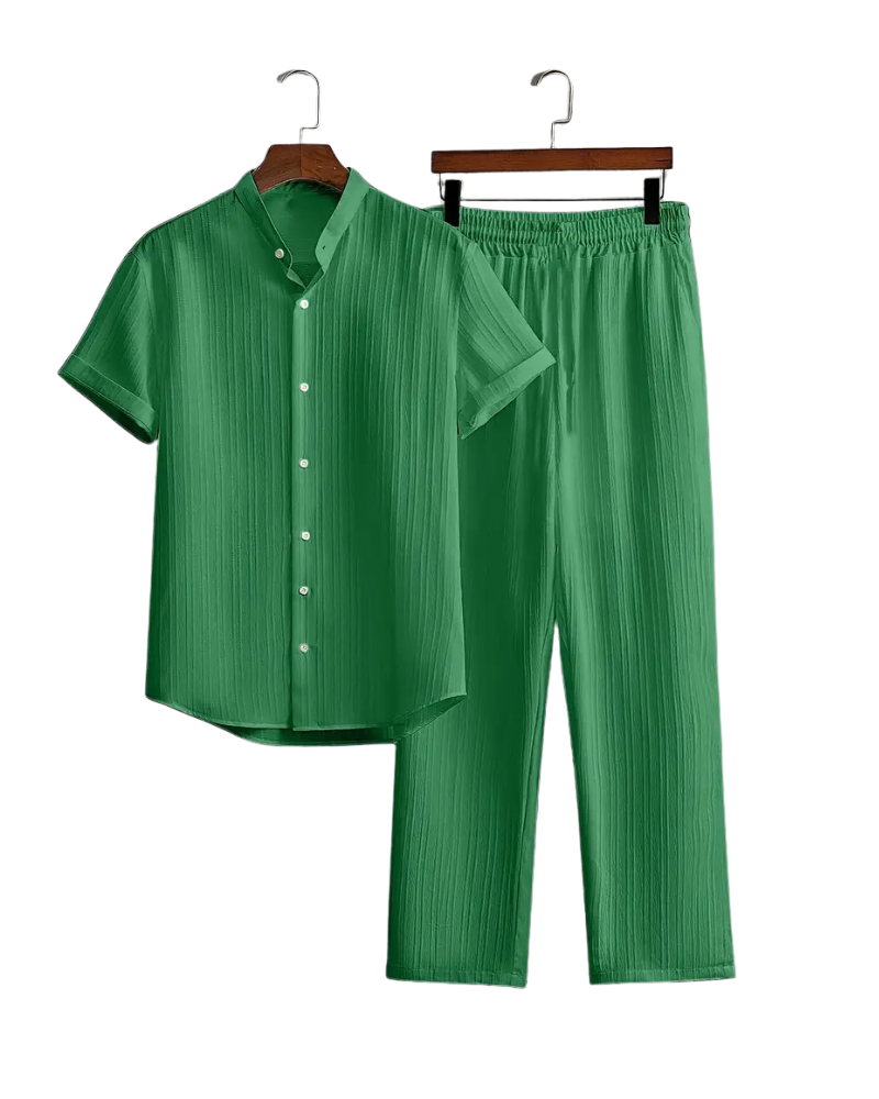 Dieses leichte Sommer-Set für Herren überzeugt mit einem bequemen Kurzarmhemd und einer langen Hose mit elastischem Bund. Der strukturierte Stoff bietet einen modernen Look und sorgt für optimalen Tragekomfort bei Hitze – ideal für Urlaub, Freizeit und entspannte Tage.