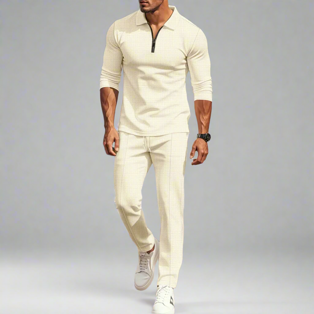 Lässiges Streetwear-Set für Herren – einfarbiges Langarm-Oberteil mit halbem Reißverschluss und passende Hose, leicht und atmungsaktiv
