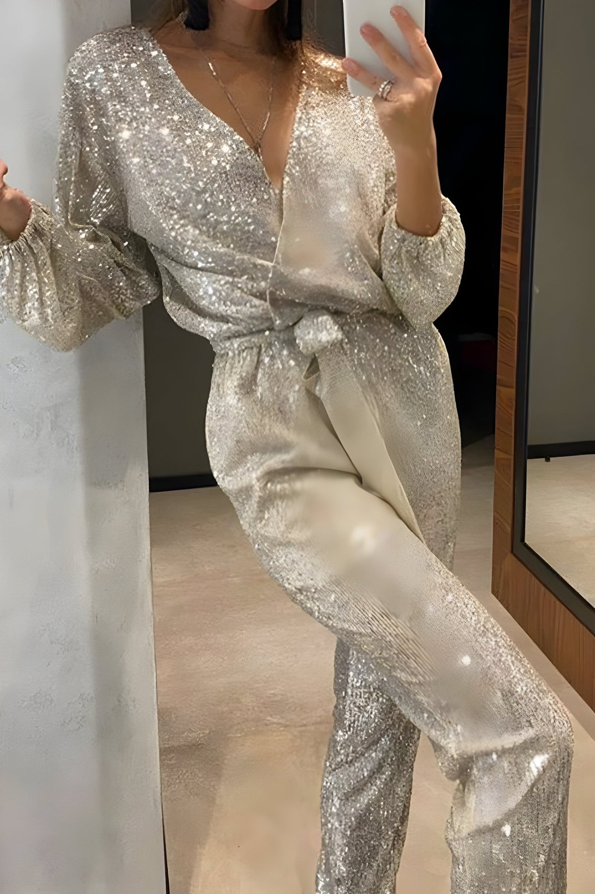 Lioren | Damen V-Ausschnitt Pailletten Jumpsuit