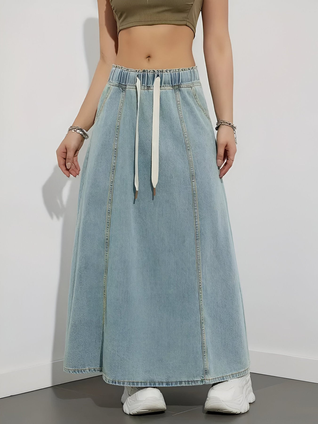 Stell dir vor, du schlüpfst in einen wunderschön lockeren Maxi-Jeansrock, der mit dir mitgeht und sich wie eine zweite Haut anfühlt. Mit dem elastischen Bund und dem Kordelzug passt er perfekt und bietet dir den ganzen Tag über Komfort. Egal, ob du durch die Stadt schlenderst oder ein gemütliches Wochenend-Frühstück genießt, dieser Rock vereint Stil und Leichtigkeit in deinem Alltag.