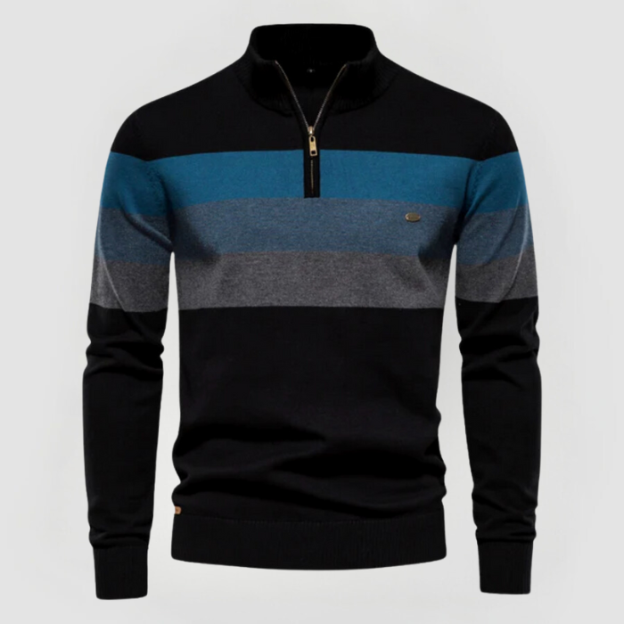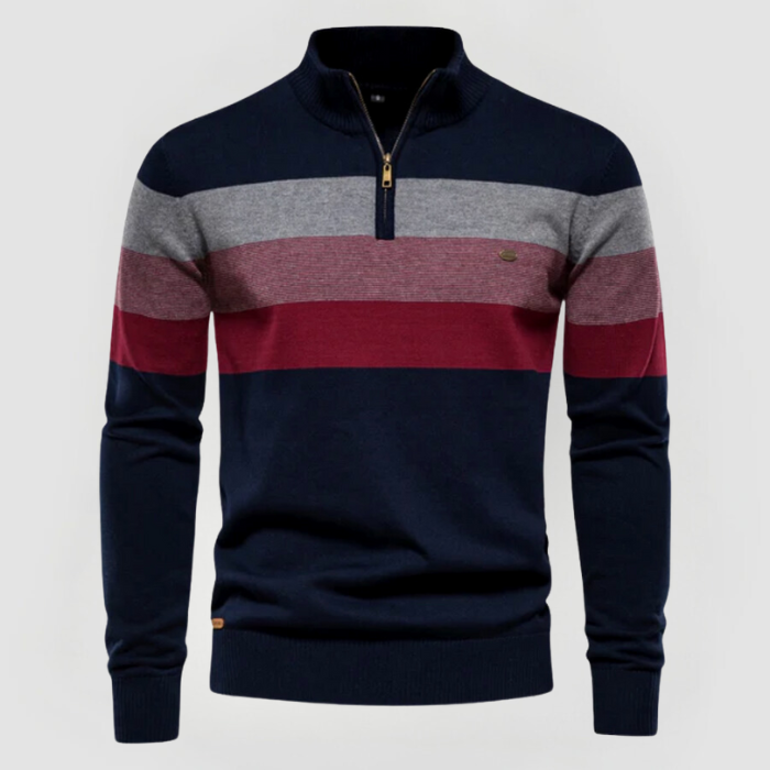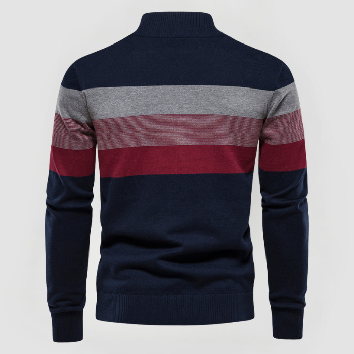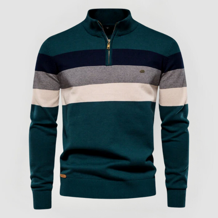 Unser beliebter Jacob Retro-Pullover vereint Komfort und Stil mit einem zeitlos klassischen Design. Breite horizontale Streifen in Erdtönen und ein Halbzip machen ihn perfekt für legere Anlässe mit modernem Flair.