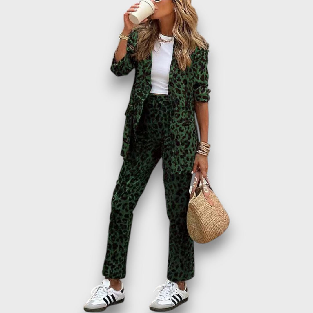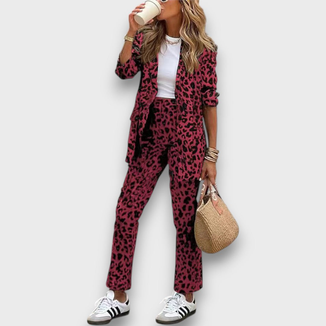 Ein Look, der Selbstbewusstsein und Lässigkeit perfekt vereint. Der lockere Blazer mit Reverskragen und Taschen bringt urbane Coolness, während die elastische Hose mit bequemem Bund für Bewegungsfreiheit sorgt. Das markante Leopardenmuster macht das Set zu einem echten Eyecatcher – egal ob für den Stadtbummel, ein Treffen mit Freunden oder entspannte Abende.