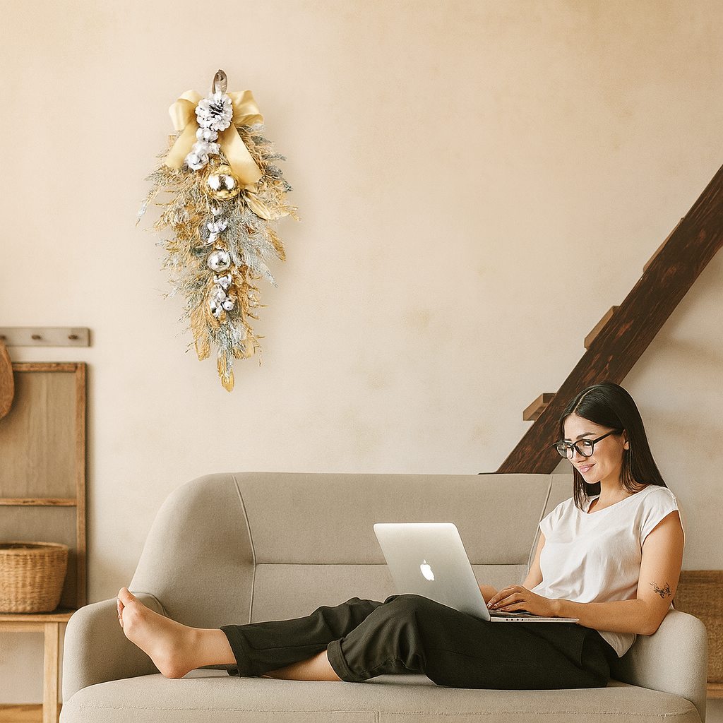 Begrüßen Sie die Magie der Festtage in Ihrem Zuhause mit dem Noellea | Festliches Tropfendekor. Dieses weihnachtliche Tropfendekor verwandelt Ihre Haustür oder Wand sofort in ein warmes, einladendes Highlight. Mit seinen edlen Texturen und funkelnden Details fängt es die wahre Essenz von Weihnachten ein und schafft eine festliche Atmosphäre für Sie und Ihre Gäste.