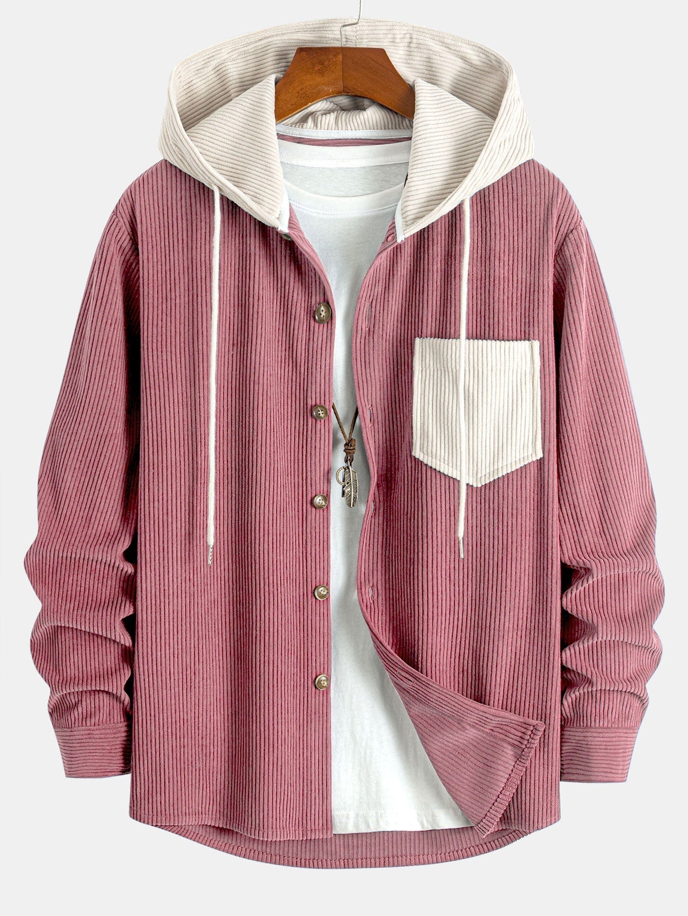 Dieses lässige Kapuzen Hemd ist aus Cord gefertigt und hat einen weichen Vintage-Schau. Die Kapuze und die Brusttaschen sind mit cremefarbenem Cord verziert, der einen auffälligen Kontrast zum Hauptteil bildet und für mehr Tiefe und Gestaltung sorgt. Es eignet sich perfekt für den Alltag oder Urlaub im Frühling und Herbst und vereint Komfort und Stil.