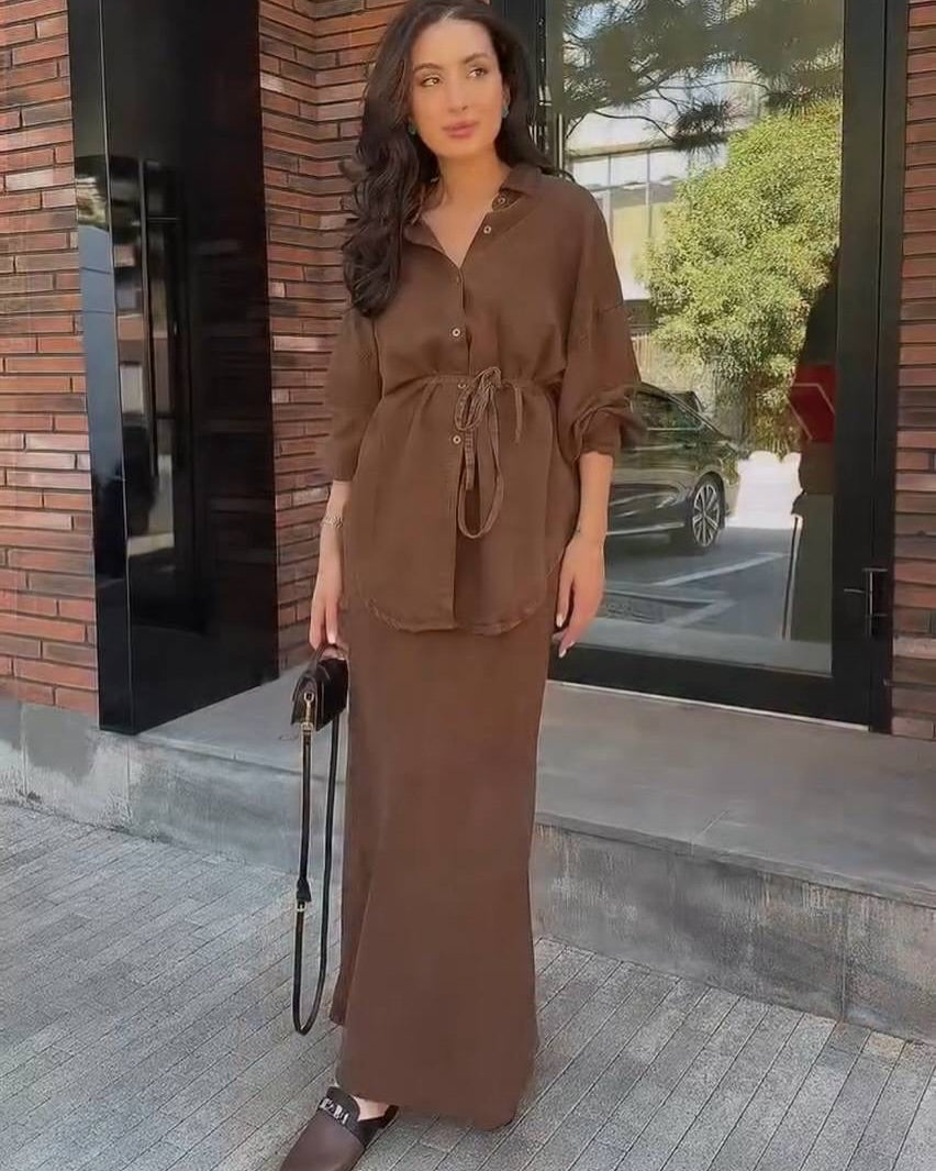 Sandra ist ein stilvolles Set aus fließender Bluse und passendem Rock, das durch seine klare Linienführung und edle Ausstrahlung überzeugt. Ob für das Büro, den Stadtbummel oder besondere Momente – dieses Zweiteiler Set schenkt Ihnen einen Look, der immer gepflegt und modern wirkt.