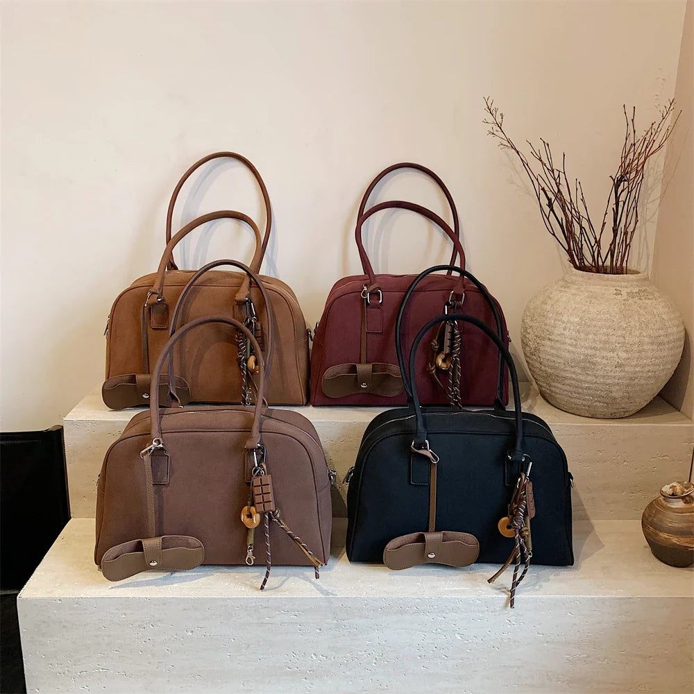 Luxuriöse Bowling Bag im modernen Design – ideal für Alltag, Büro oder Reisen. Die Kombination aus Wildleder-Optik und dekorativen Details macht sie zu einem eleganten Begleiter mit viel Stauraum.