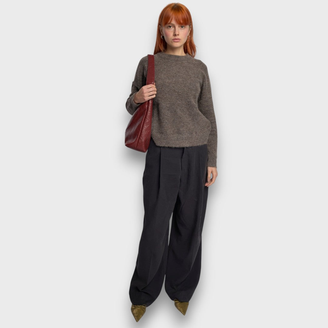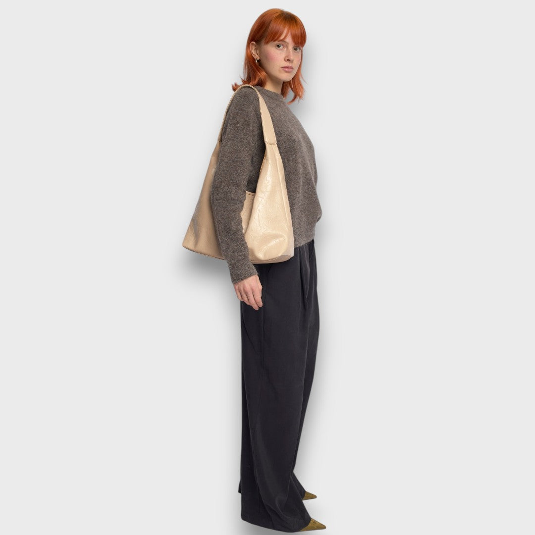 Velmira kombiniert zurückhaltenden Stil mit durchdachter Funktion. Die weiche Form, die sichtbare Naht in der Mitte und der breite Riemen verleihen ihr eine lässige Eleganz. Im Inneren sorgt eine herausnehmbare Kosmetiktasche für Ordnung – und selbst ein 13-Zoll-Laptop findet bequem Platz. Ideal für Tage, an denen du alles dabeihaben möchtest, ohne auf Stil zu verzichten.